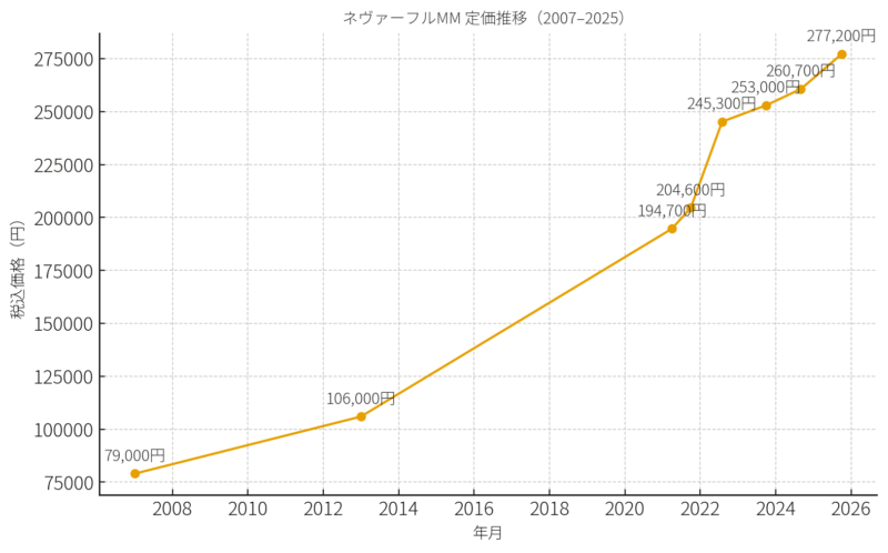 代表的な「ネヴァーフルMM(M46975)」の定価は、2007年の79,000円から、2025年10月時点で277,200円にまで上昇しました。