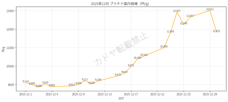 2025年12月のプラチナ相場は、月中旬以降に上昇の勢いが一気に強まり、短期間で価格水準が大きく切り上がりました。