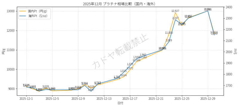 12月は、プラチナ相場の評価が一段階引き上げられた月であると同時に、値動きの大きさが改めて意識された月でもありました。