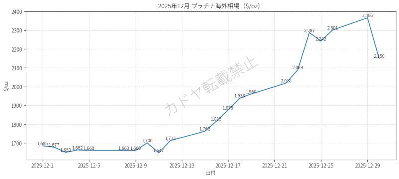 2025年12月のプラチナ相場は、月前半と後半で値動きの雰囲気が大きく異なる1か月でした。