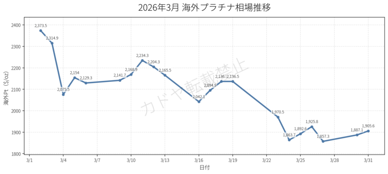 結果として、2026年3月の海外プラチナ相場は次のような推移となりました。