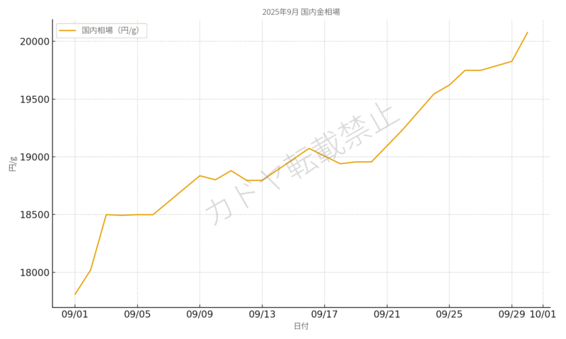 2025年9月の店頭金相場は、大きな上昇基調を示し、月末にはついに 2万円の大台を突破しました。
