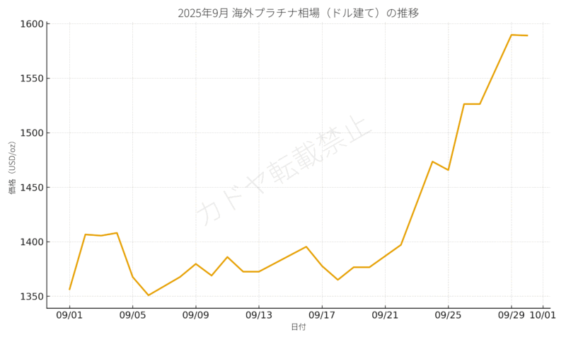 9月の海外プラチナ相場は、月初の1,356ドル/ozから月末の1,589ドル/ozへと上昇し、およそ