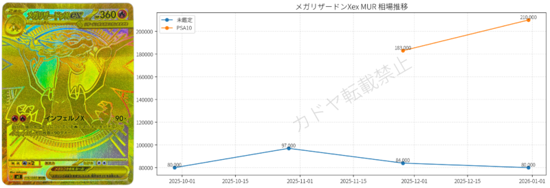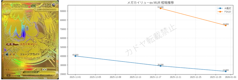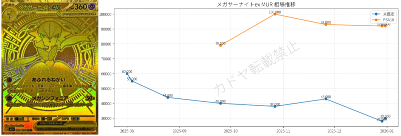 メガサーナイトex MURは、12月相場において未鑑定とPSA10で値動きの方向性が分かれたカードとなりました。