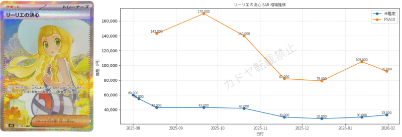 1月はカードごとの差が広がった月でしたが、リーリエのピッピex SARは、キャラクター人気と供給構造が素直に相場へ反映されたカードといえるでしょう。