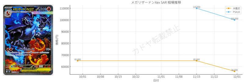 メガリザードンXex SARは、9月末から11月中旬にかけて横ばいで推移。しかし、11月下旬になって明確な調整が入りました。