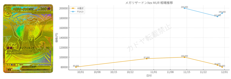 供給イベントが重なり、他のカードが大きく下落した11月においても、メガリザードンXex MURは明確な強さを見せた、数少ない高額カードのひとつといえます。